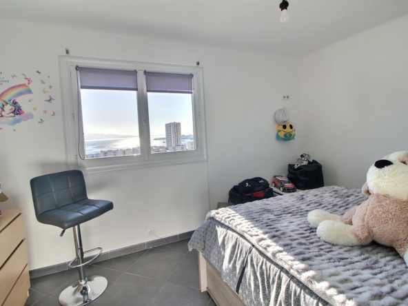 La terrasse de 11m2 exposée est jouit d’une jolie vue sur la mer.