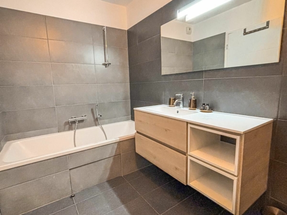 D’une superficie généreuse de 91.28 m², ce appartement se situe au 2ème étage avec ascenseur et offre des volumes confortables ainsi qu’une distribution fonctionnelle. L’appartement se compose d’un grand séjour de 32m2 donnant sur une terrasse d’hiver de 12 m² pouvant servir de salle à manger, d’une cuisine équipée, de deux chambres, d’une salle de bains contemporaine et de WC séparés.