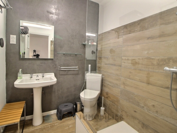 Un hall d’entrée desservant une salle d’eau avec WC, un séjour/cuisine lumineux d’une superficie de 24.40m² et une chambre avec dressing d’une superficie de 13,90m².