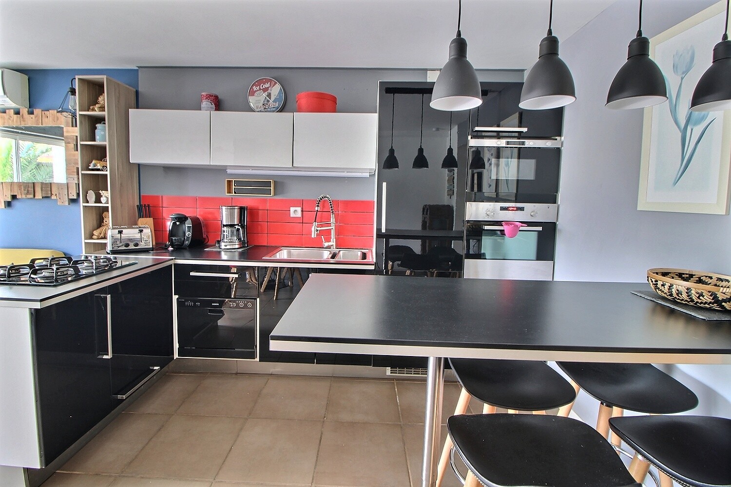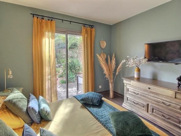 Édifiée sur un terrain paysager de 1561 m², l’habitation principale de type T5 séduit par ses volumes et la qualité de ses prestations. L’espace de vie, chaleureux et ouvert, s’articule autour d’équipements modernes et soignés : climatisation réversible, poêle à bois, menuiseries aluminium double vitrage, volets électriques et domotique.