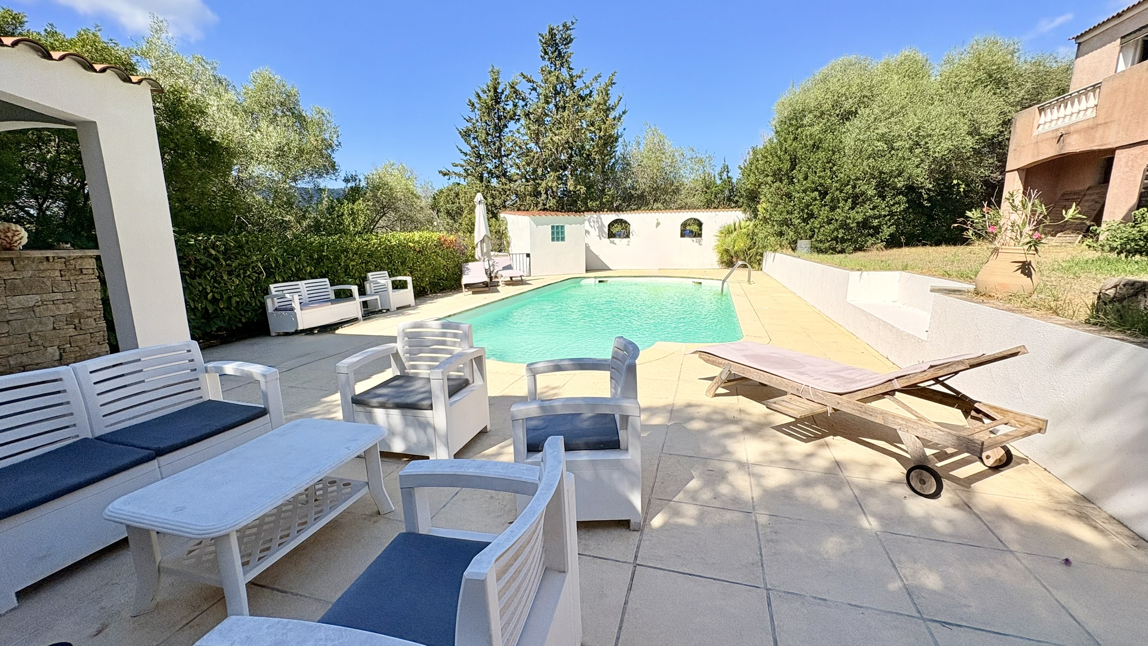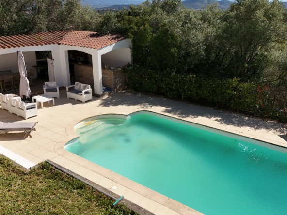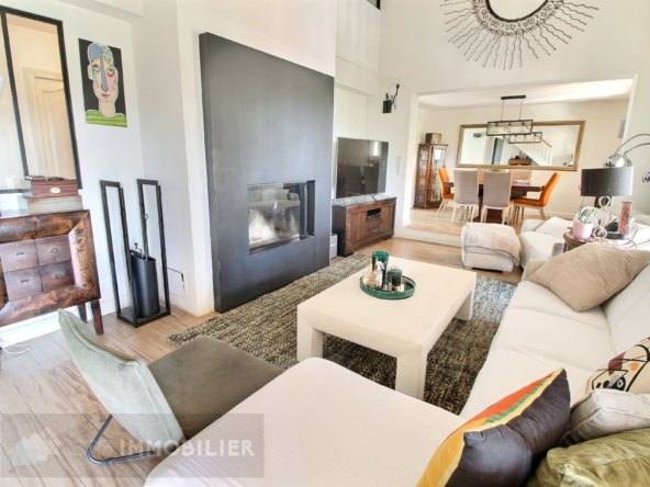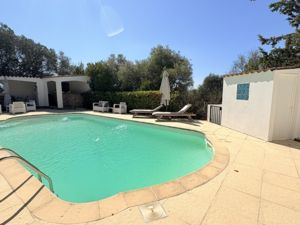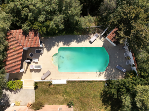 Ses Prestations : portail électrique, menuiserie PVC double vitrage, volets roulants électriques, climatisation réversible, cheminée, piscine au sel avec pool house, visiophone et alarme.