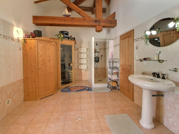 - Une grande salle de bain avec douche, baignoire et sauna
